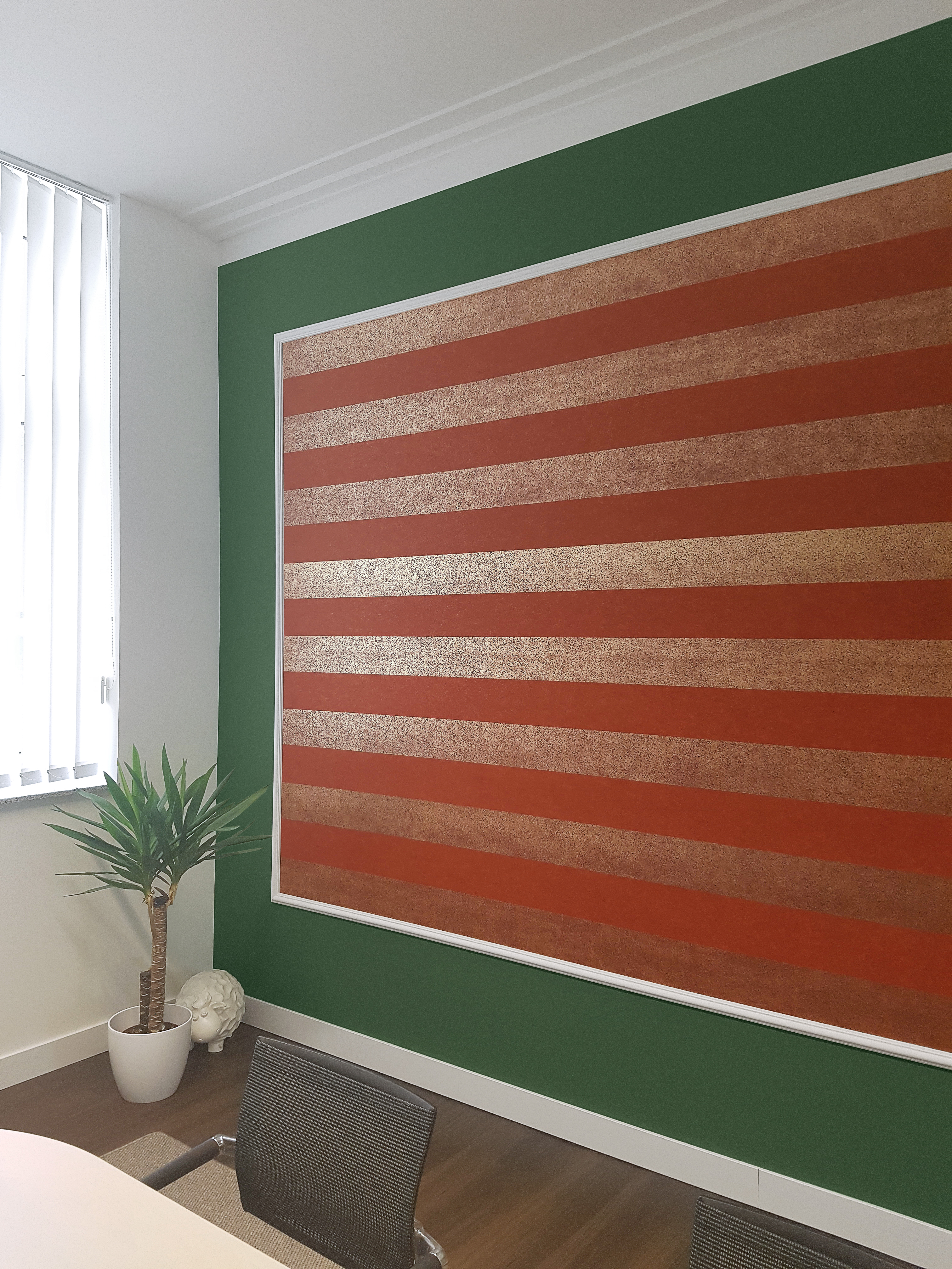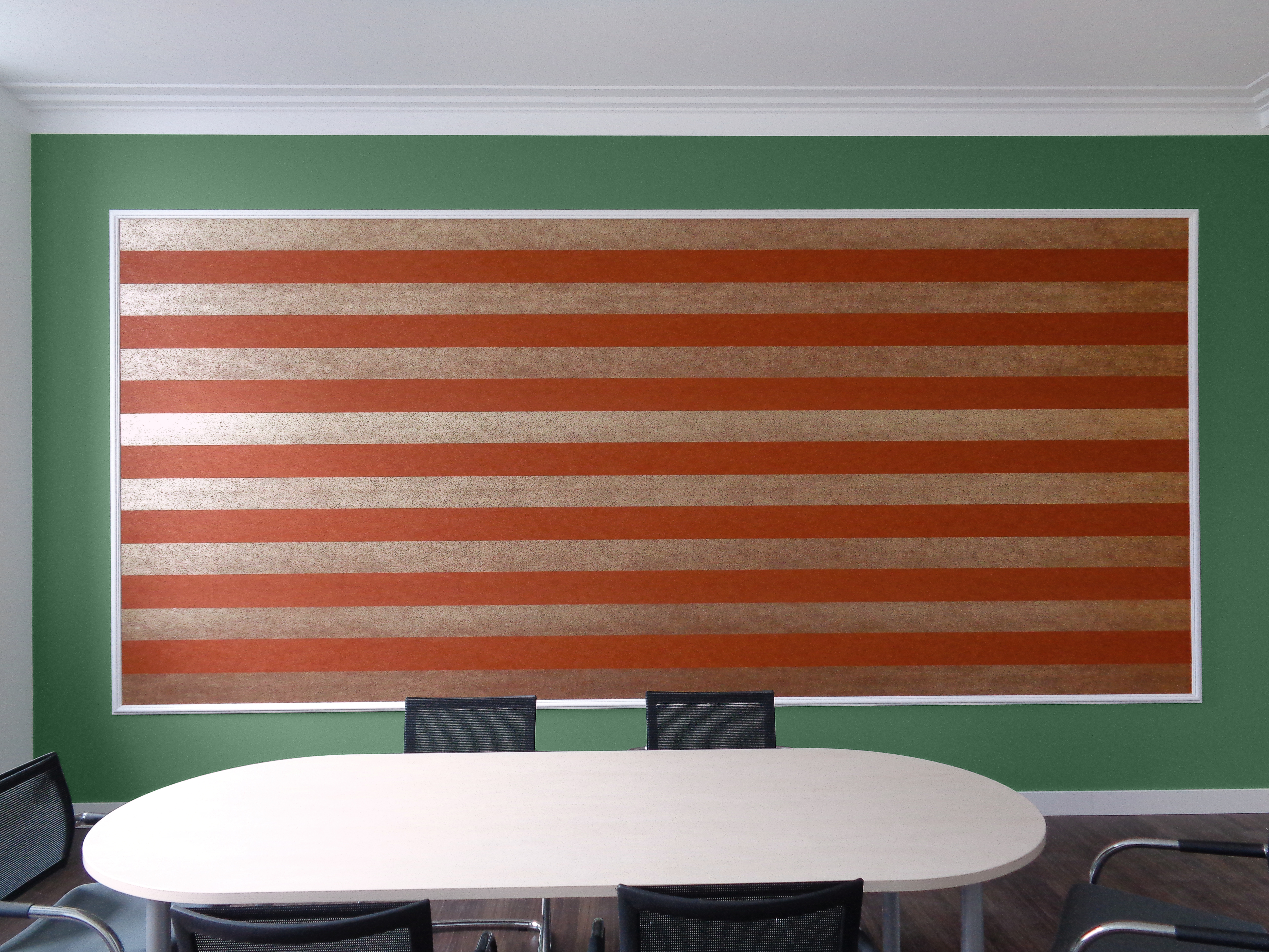 In unserem Besprechungszimmer haben wir großflächig eine hochwertige Dekortapete in einer Streifenoptik angebracht.
